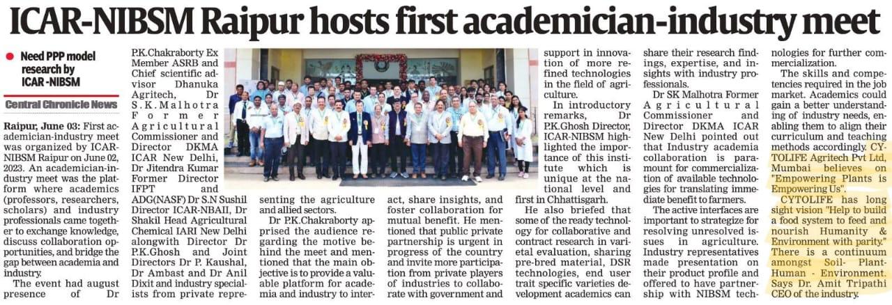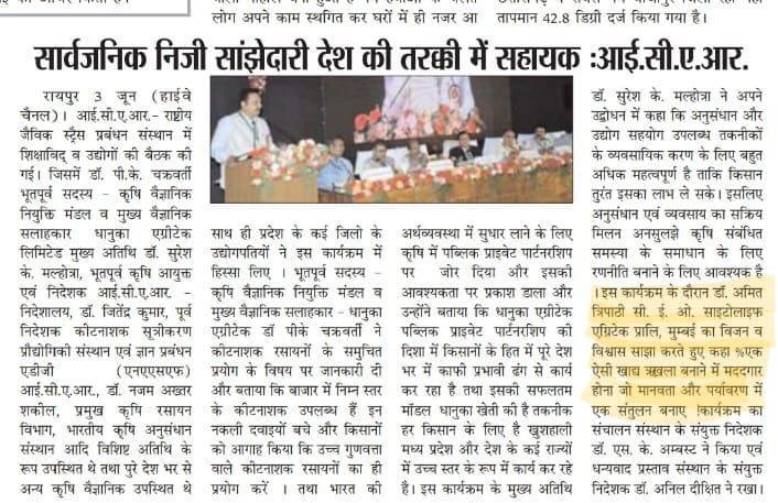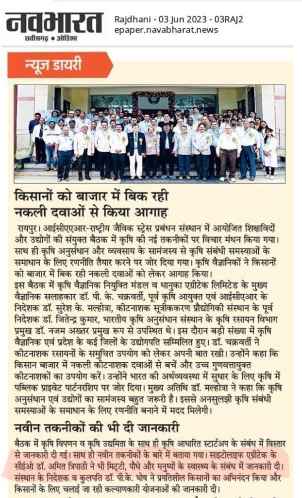 दिनांक 02.06.2023 को ICAR - NIBSM (भारतीय कृषि अनुसंधान परिषद, भारत सरकार) के आयोजित कार्यक्रम में साइटोलाइफ़ एग्रिटेक प्रा ली, मुम्बई को विशिष्ट रूप से स्थान दिया गया और साइटोलाइफ़ के वैज्ञानिक समाधान, अमेरिकन टेक्नॉलोजी के साथ Agri-Diagnostic की कार्य पद्धति तथा उत्पादों को सभी वैज्ञानिकों ने खूब सराहा, कुछ न्यूज़ पेपर की छाया ..